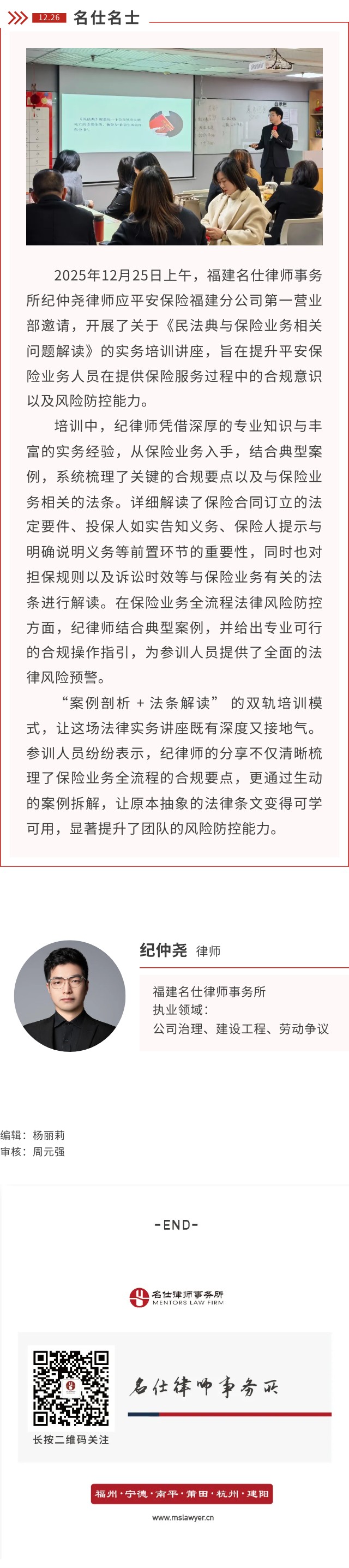纪仲尧律师受邀为平安保险福建分公司开展实务培训讲座